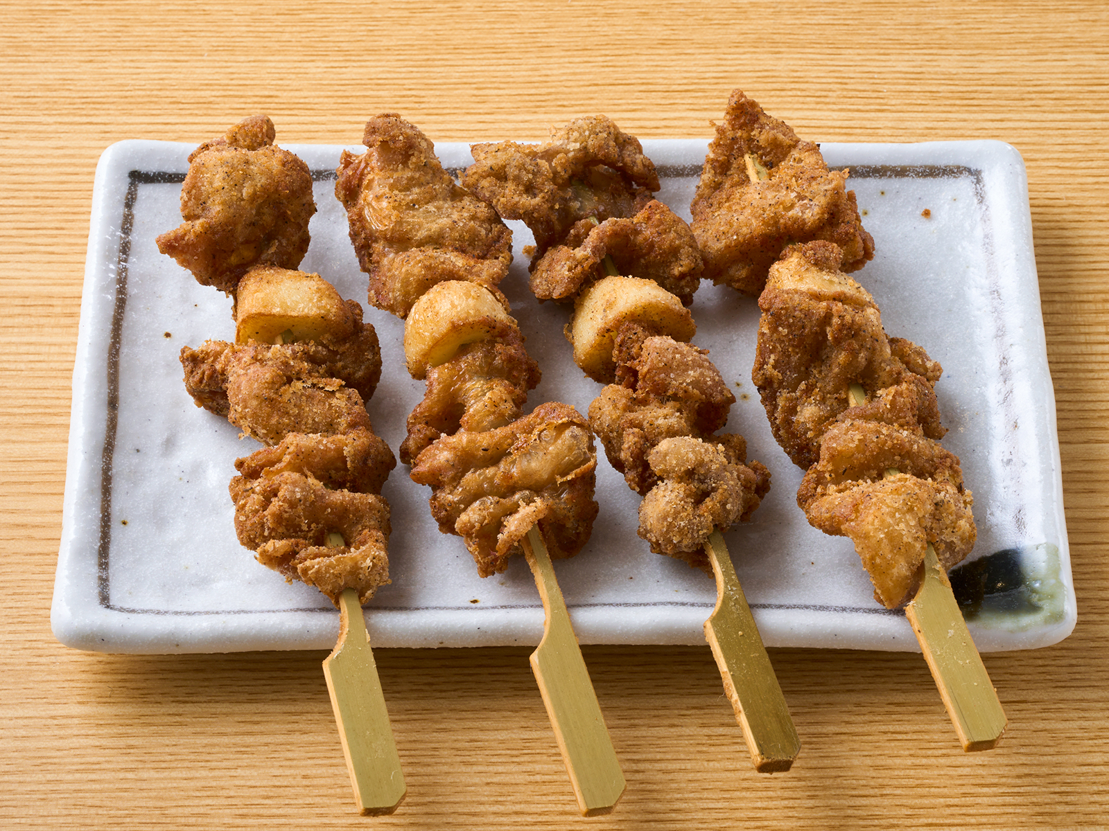 カリカリ鶏皮とホクホクのニンニクの「鶏皮ニンニク揚げ串」や手作りの肉味噌を使った
